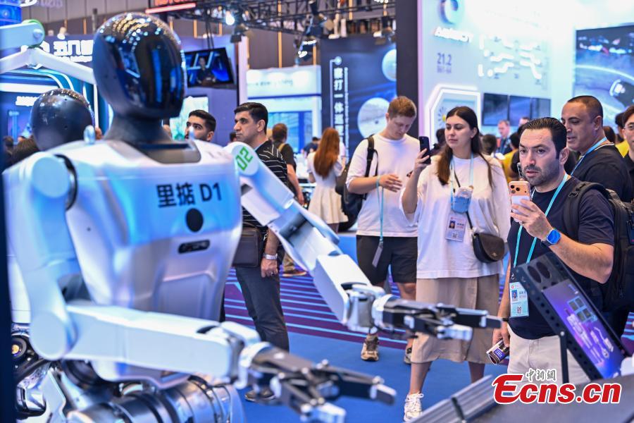 A buyer is attracted by a humanoid robot at the 138th edition of the China Import and Export Fair in Guangzhou, Guangdong Province, Oct. 15, 2025. (Photo: China News Service/Chen Jimin)