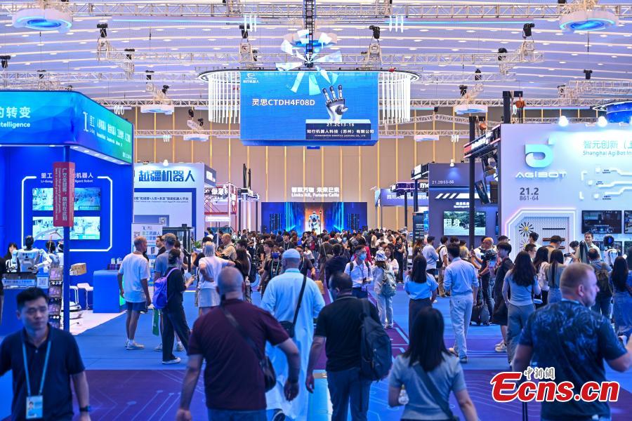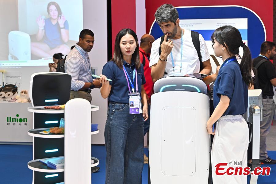Photo taken on Oct. 15, 2025 shows a continuous flow of visitors in the service robot zone at the 138th edition of the China Import and Export Fair in Guangzhou, Guangdong Province. (Photo: China News Service/Chen Jimin)