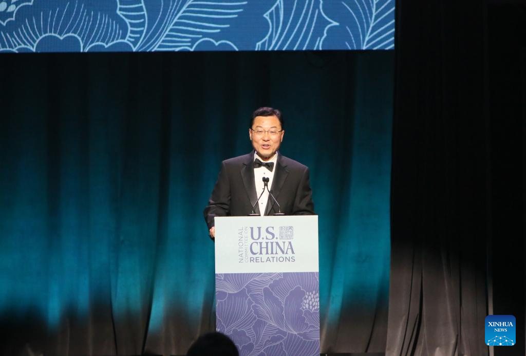 Chinese Ambassador to the United States Xie Feng speaks at the annual gala dinner of the National Committee on U.S.-China Relations held in New York, the United States, Oct. 14, 2025. Chinese Ambassador to the United States Xie Feng on Tuesday urged Washington to "return to reason" and "stop applying maximum pressure," warning that "a tariff war or trade war should not be fought and cannot be won." Speaking at the annual gala dinner of the National Committee on U.S.-China Relations, Xie said that "a tariff war or trade war will serve no one's interest in the end." (Xinhua/Zhang Fengguo)