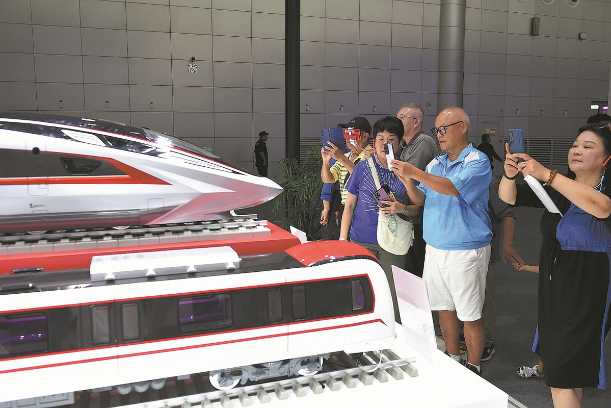 Members of a Taiwan delegation take pictures of a high-speed train model on Sept 23 during the 2025 World Manufacturing Convention in Hefei, Anhui province. ZHAO QIANG/CHINA NEWS SERVICE