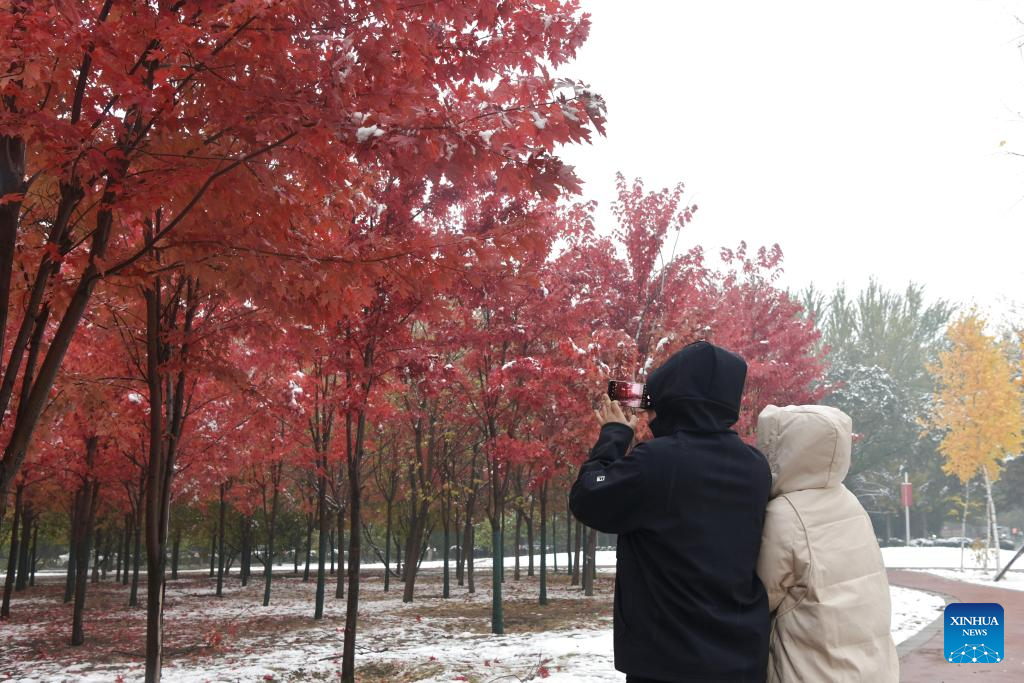 People take photos of trees after a snowfall in Beilin District of Suihua City, northeast China's Heilongjiang Province, Oct. 15, 2025. A snowfall hit part of Heilongjiang on Wednesday. (Photo by Liu Huapeng/Xinhua)