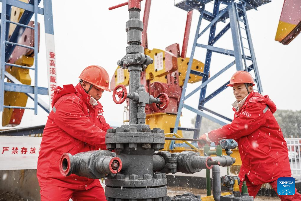 Staff members work in the snow at Daqing Oilfield in Daqing, northeast China's Heilongjiang Province, Oct. 15, 2025. A snowfall hit part of Heilongjiang on Wednesday. (Photo by Ma Ke/Xinhua)