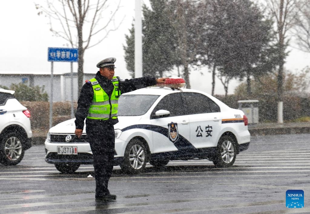 A police officer guides the traffic in the snow in Shuangyashan City, northeast China's Heilongjiang Province, Oct. 15, 2025. A snowfall hit part of Heilongjiang on Wednesday. (Photo by Han Yang/Xinhua)