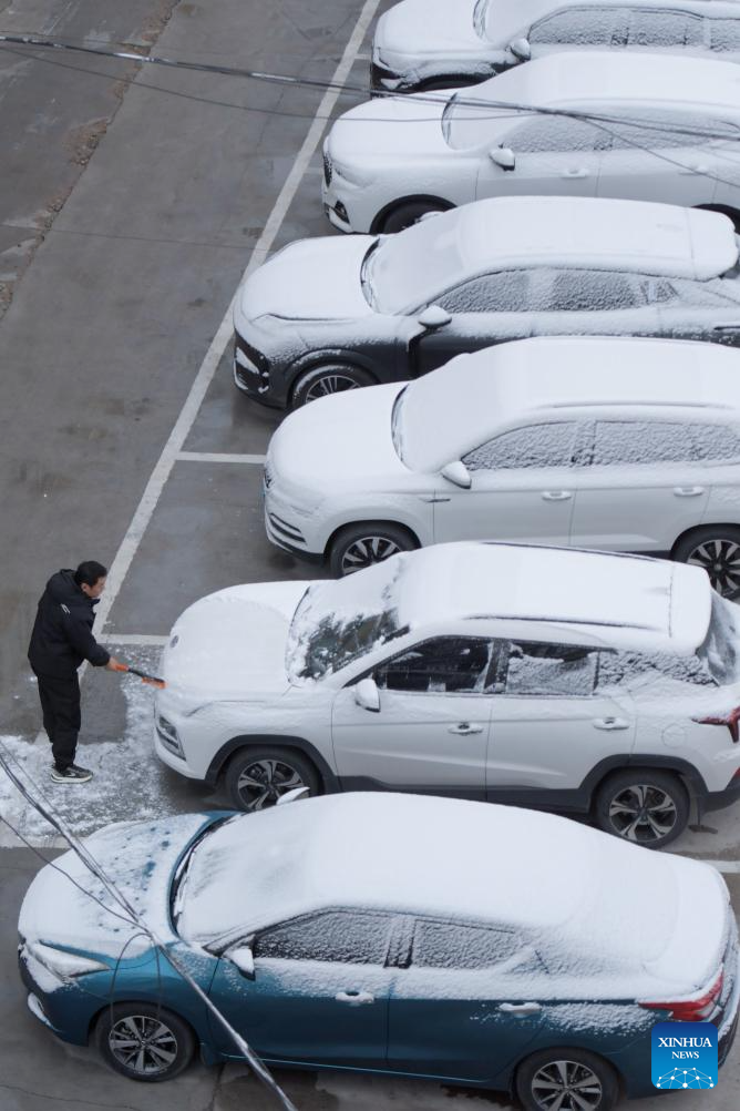 A man clears the snow on a car in Qiqihar City, northeast China's Heilongjiang Province, Oct. 15, 2025. A snowfall hit part of Heilongjiang on Wednesday. (Photo by Wang Yonggang/Xinhua)