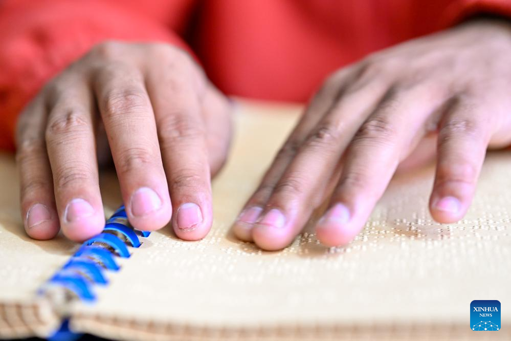 Tawa Tsering reads a braille book in Lhasa, southwest China's Xizang Autonomous Region, Oct. 10, 2025.(Xinhua/Zhang Cheng)