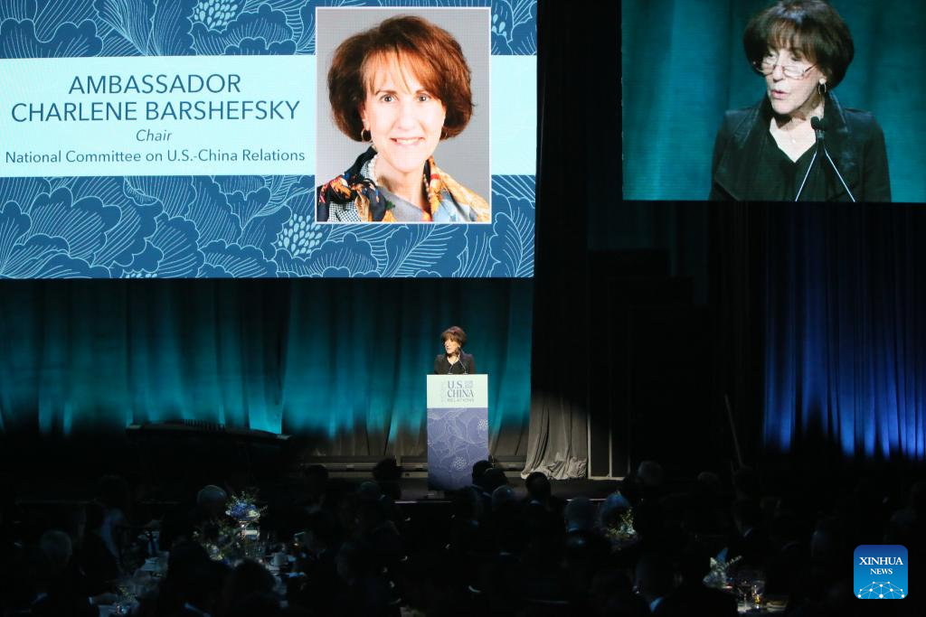 Charlene Barshefsky, former U.S. trade representative and board chair of the National Committee on U.S.-China Relations (NCUSCR), speaks at the annual Gala Dinner of the NCUSCR in New York, the United States, on Oct. 14, 2025. Speakers at the annual gala of the National Committee on U.S.-China Relations on Tuesday called for continued dialogue, practical engagement and increased collaboration between Washington and Beijing to stabilize the world's most important bilateral relationship. (Xinhua/Zhang Fengguo)