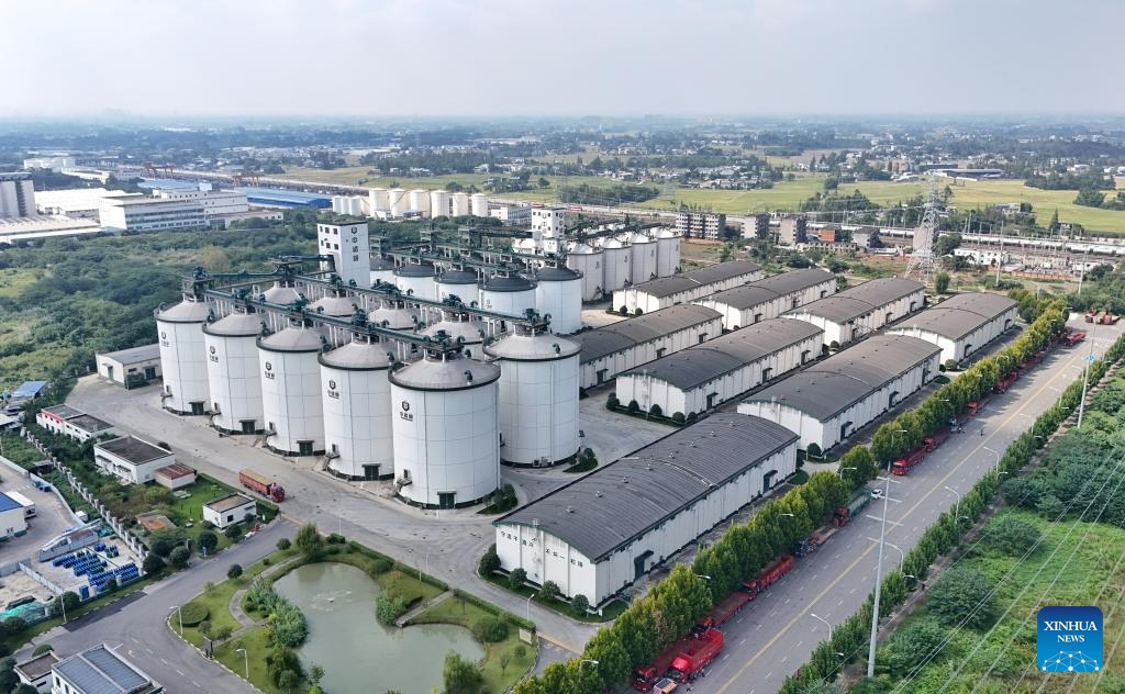 This aerial drone photo taken on Oct. 15, 2025 shows the grain storage facilities at a branch company of China Grain Reserves Group (Sinograin) in Chengdu, southwest China's Sichuan Province.