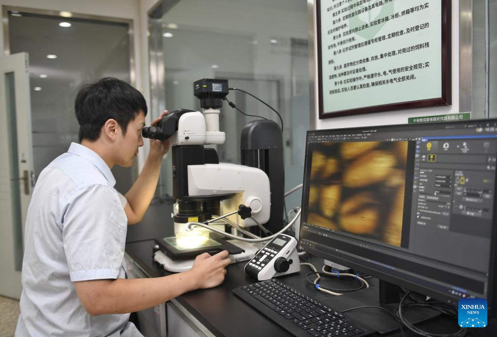 A researcher conducts pest-control experiments at a branch company of China Grain Reserves Group (Sinograin) in Chengdu, southwest China's Sichuan Province, Oct. 15, 2025.