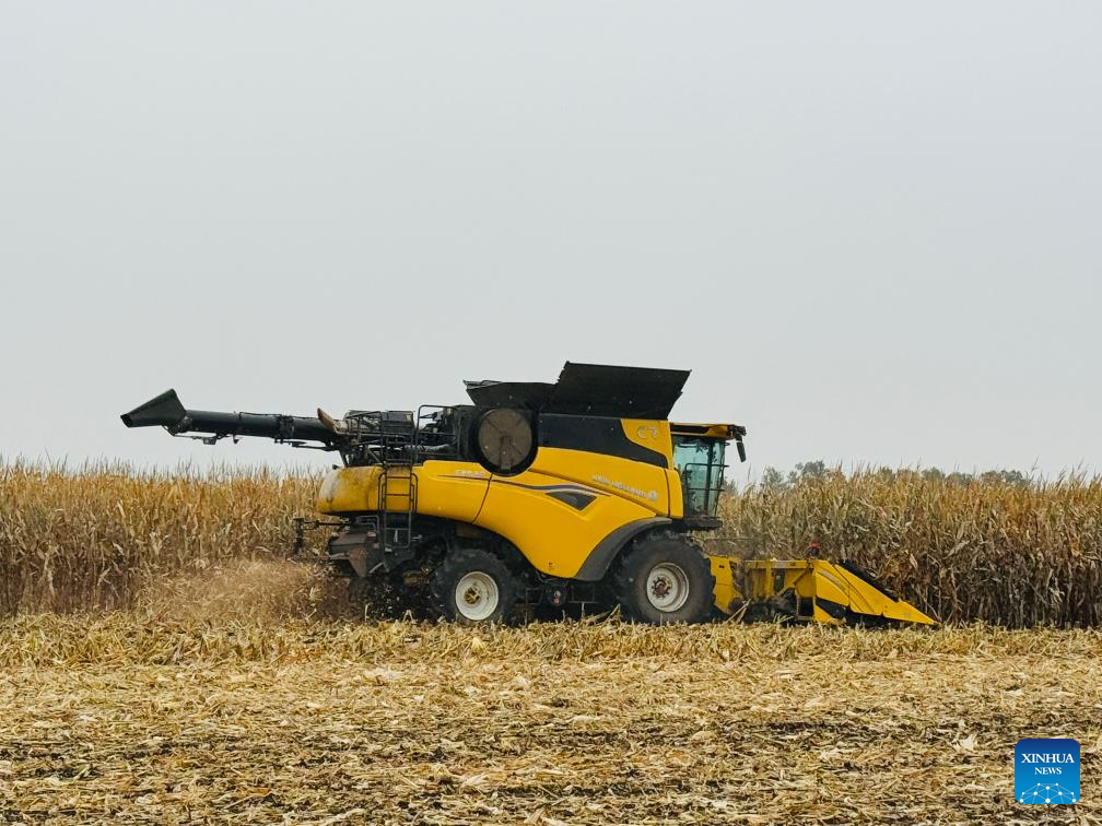 A harvester produced by the Case New Holland (CNH) works in a corn field in Shuangcheng District of Harbin, northeast China's Heilongjiang Province, Oct. 14, 2025. (Xinhua/Sun Xiaoyu)