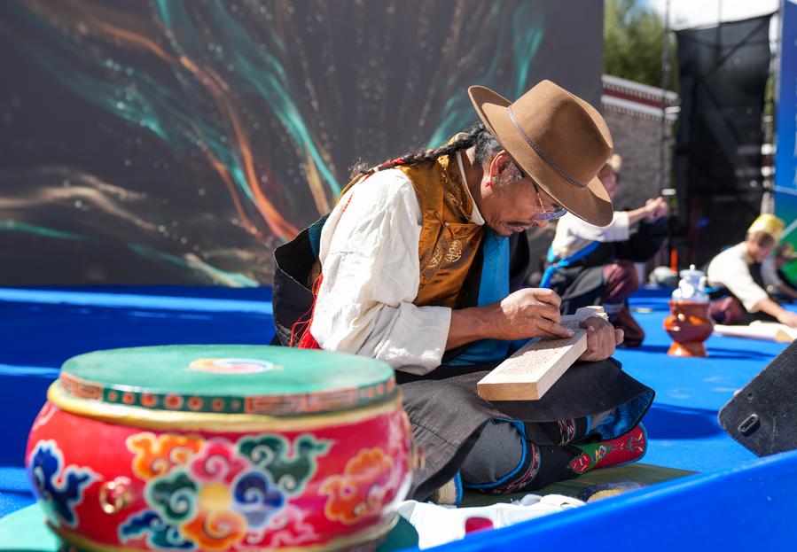 A craftsman makes wood carvings at the opening ceremony of a tourism festival featuring traditional Tibetan incense culture in Nyemo County of Lhasa, southwest China's Xizang Autonomous Region, Sept. 12, 2025. (Xinhua/Jigme Dorje)