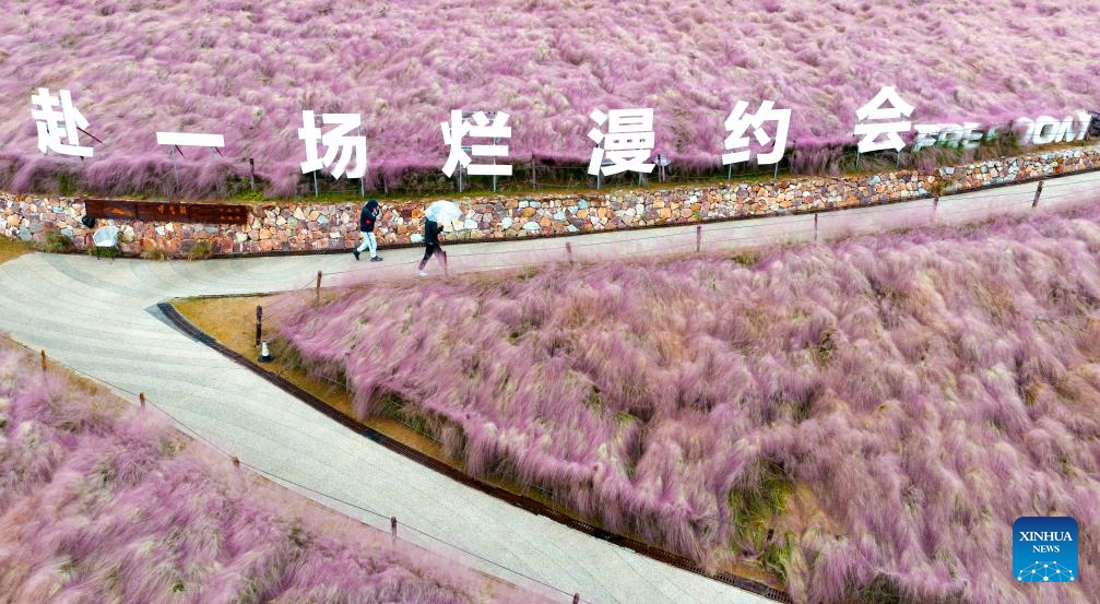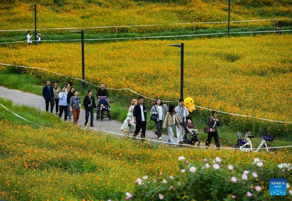 People enjoy sightseeing at the Yiwu Botanical Garden in Yiwu City, east China's Zhejiang Province, on Oct. 19, 2025. People are heading outdoors to enjoy the pleasant autumn days across China. (Photo by Shi Kuanbing/Xinhua)