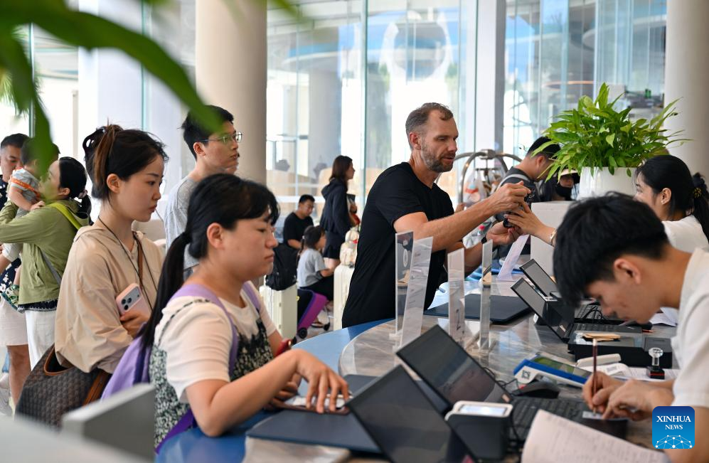Tourists check in and out at a hotel in Lingshui Li Autonomous County in south China's Hainan Province, Oct. 18, 2025. Many tourists choose to travel off-peak to China's island province of Hainan, a popular tourist destination, as prices of transport and accommodation dip following China's National Day holiday. (Xinhua/Guo Cheng)