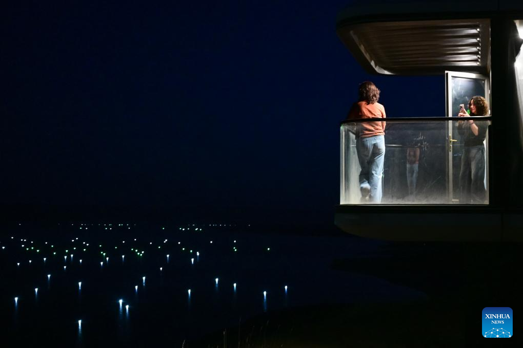 A drone photo taken on Oct. 17, 2025 shows fishing light attractors in the Longyang Gorge area in Gonghe County of Hainan Tibetan Autonomous Prefecture, northwest China's Qinghai Province. Each year from late August to late November, fishermen in Longyang Gorge are busy harvesting silver fish.