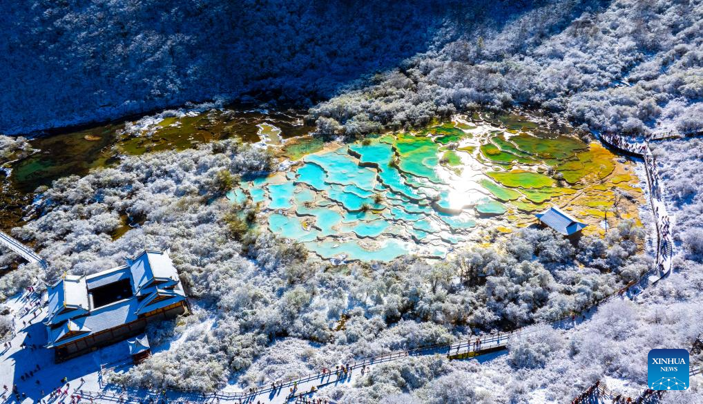 An aerial drone photo taken on Oct. 21, 2025 shows a view of a colorful pond cluster after snow at the Huanglong scenic area in Aba Tibetan and Qiang Autonomous Prefecture, southwest China's Sichuan Province.