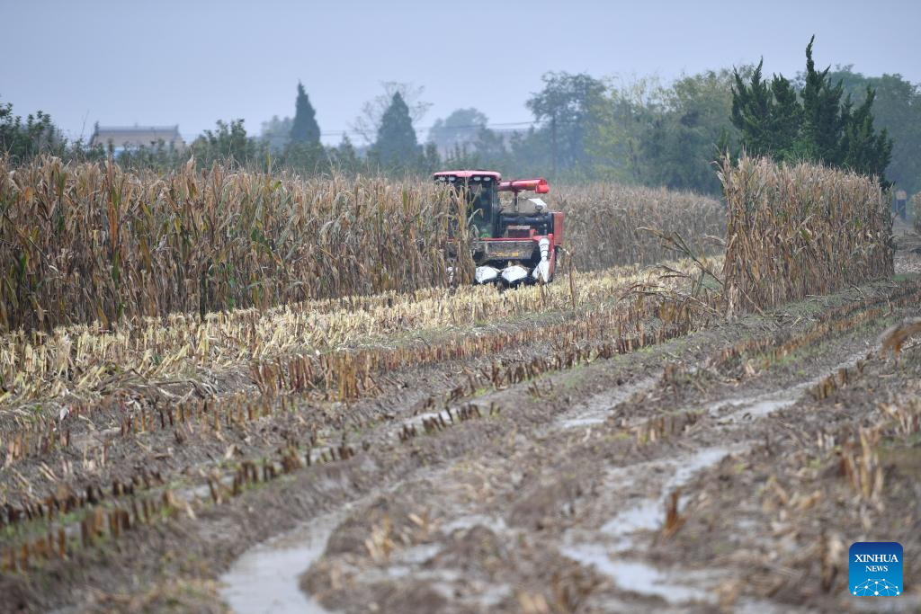 A crawler reaper harvests corn in Dengqiao Village of Dacheng Town, Sanyuan County in northwest China's Shaanxi Province, on Oct. 21, 2025. In order to cope with the continuous rainy weather at the current critical period for autumn grain harvest, Shaanxi Province has dispatched crawler harvesters, mobile grain dryers, color sorters and other machinery to improve the harvesting efficiency. By far, the province has established 476 emergency operation teams and 765 grain drying stations, with a daily drying capacity of over 70,000 tonnes, providing a solid guarantee for the harvesting work. (Xinhua/Shao Rui)
