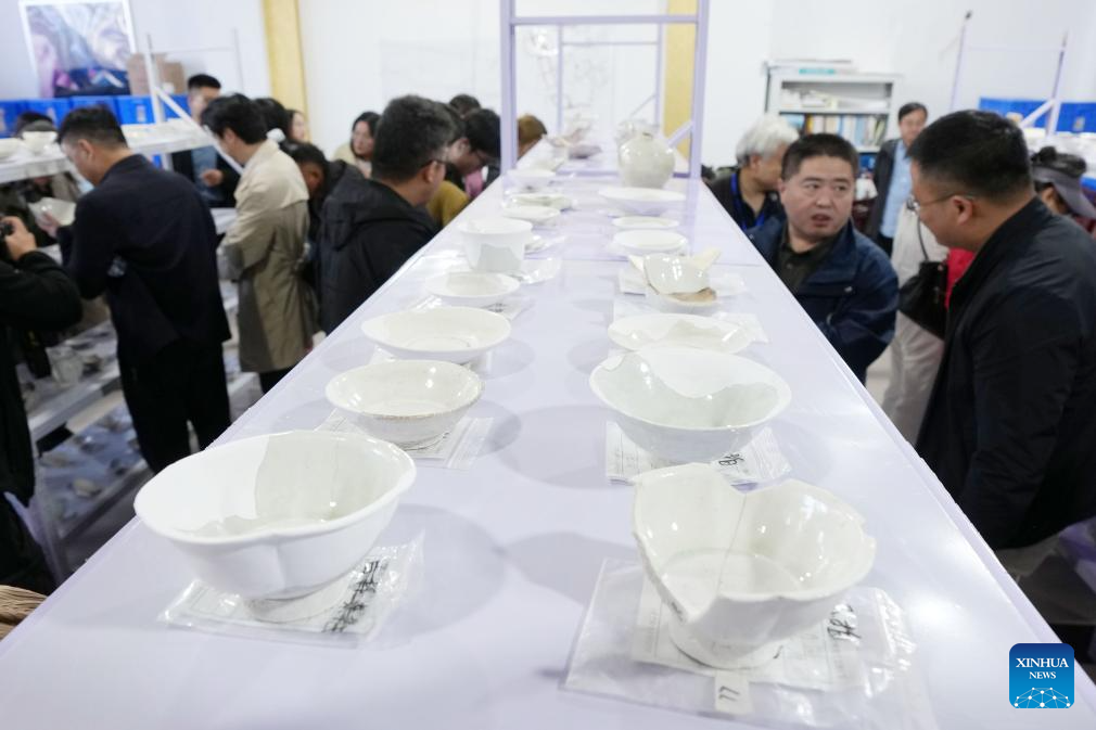This photo shows samples of excavated white porcelain wares displayed at the cultural relics storage room of the archaeologist team working on the remnants of the Suyukou kiln, in Yinchuan, capital of northwest China's Ningxia Hui Autonomous Region, Oct. 13, 2025. Remnants of the Suyukou kiln were discovered in 2017 in Yinchuan, capital of Ningxia, and cover an area of roughly 40,000 square meters. (Xinhua/Li He)