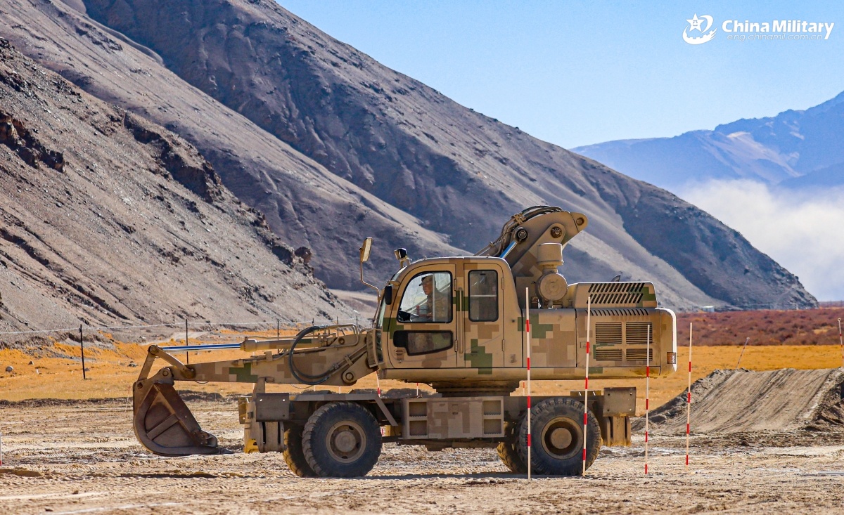 An engineer soldier assigned to a regiment under the Chinese PLA Xinjiang Military Command operates an excavator to complete training subjects during a training exercise on October 14, 2025. (eng.chinamil.com.cn/Photo by Liu Fasen)