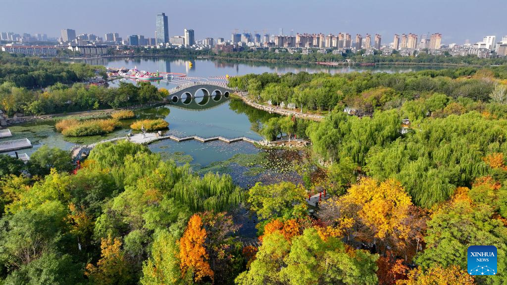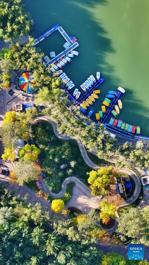 An aerial drone photo taken on Oct. 15, 2025 shows the autumn scenery of Haibao Park in Yinchuan, northwest China's Ningxia Hui Autonomous Region. (Photo by Li Jing/Xinhua)