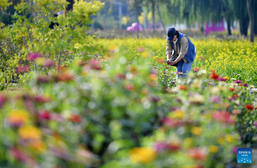 A citizen takes photos of flowers by the Diannong River in Yinchuan, northwest China's Ningxia Hui Autonomous Region, on Oct. 15, 2025. (Photo by Li Jing/Xinhua)