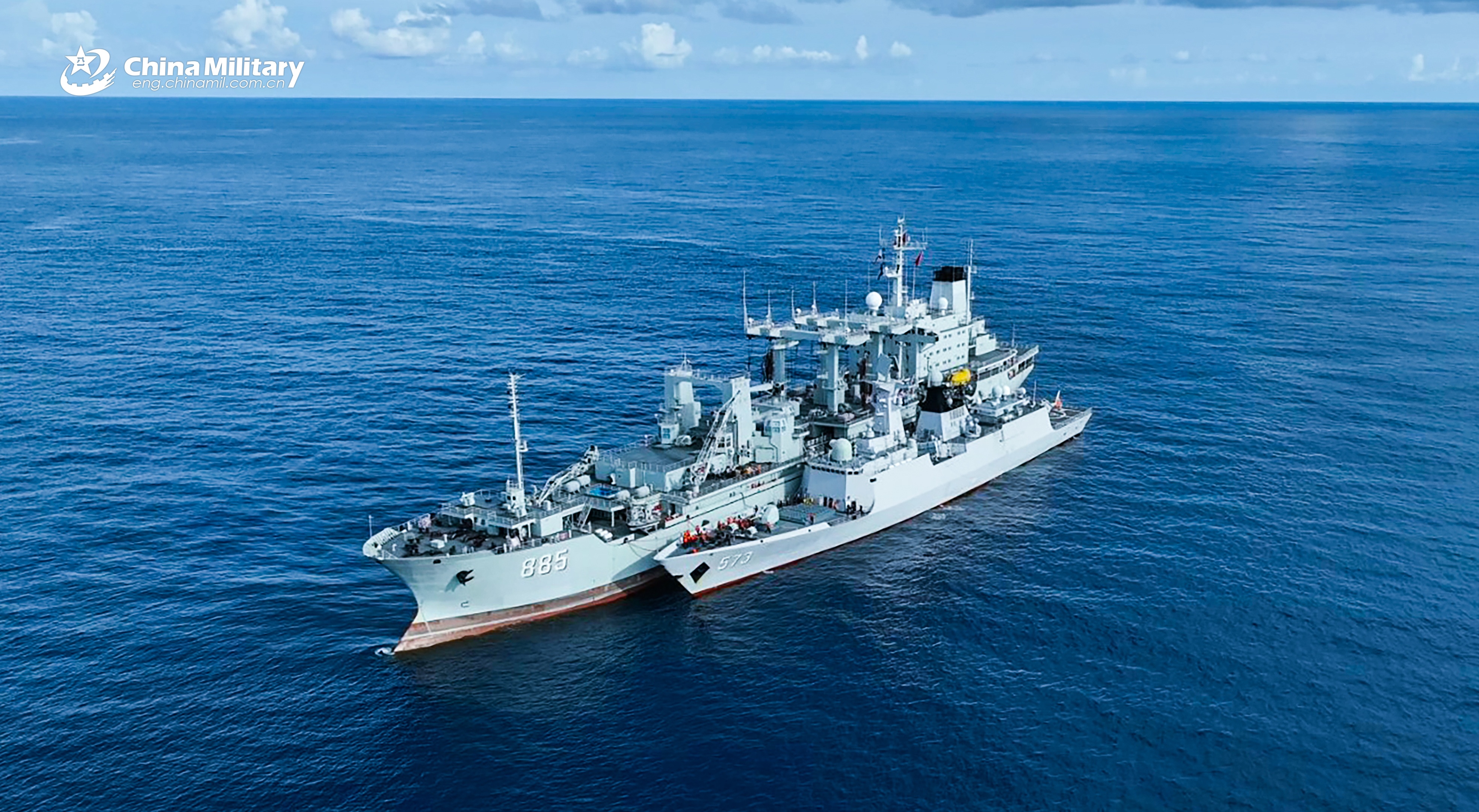 Frigate Liuzhou (Hull 573) and comprehensive supply ship Qinghaihu (Hull 885) attached to a flotilla with the navy under the Chinese PLA Southern Theater Command conduct alongside replenishment while moored at sea during a maritime training exercise. (eng.chinamil.com.cn/Photo by Li Junlin)