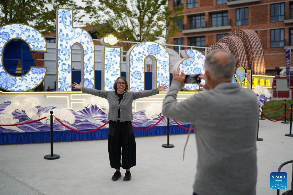 Christiane Toewe poses for photos at Taoxichuan Ceramic Art Avenue in Jingdezhen City, east China's Jiangxi Province, Oct. 19, 2025. (Xinhua/Zhou Mi)