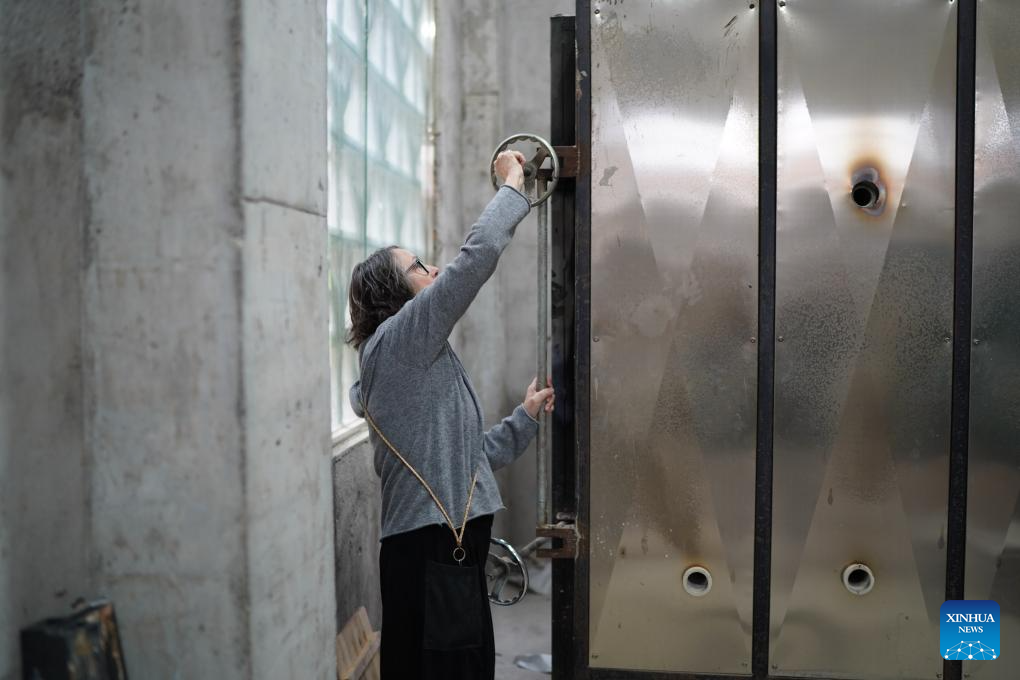 Christiane Toewe opens a kiln door to check the condition of ceramic works in Jingdezhen City, east China's Jiangxi Province, Oct. 19, 2025. (Xinhua/Zhou Mi)