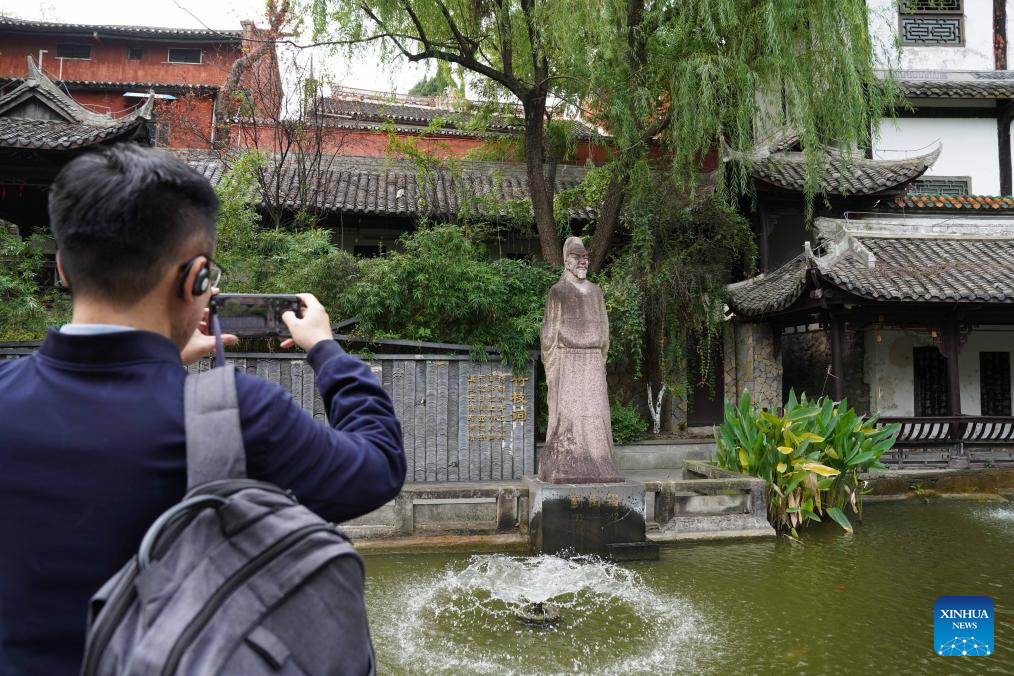 People takes photos of a statue of Liu Yuxi, a Chinese poet in the Tang Dynasty (618-907), at the ancient town of Baidi in Fengjie County, southwest China's Chongqing Municipality, Oct. 27, 2025. Fengjie, a county in Chongqing where the Kuimen gateway to the magnificent gorges of the Yangtze River is located, gained its reputation as the "city of poetry," as poets, military figures and politicians in history wrote extensively about the forbidding landscape of rapid currents and narrow waterways.