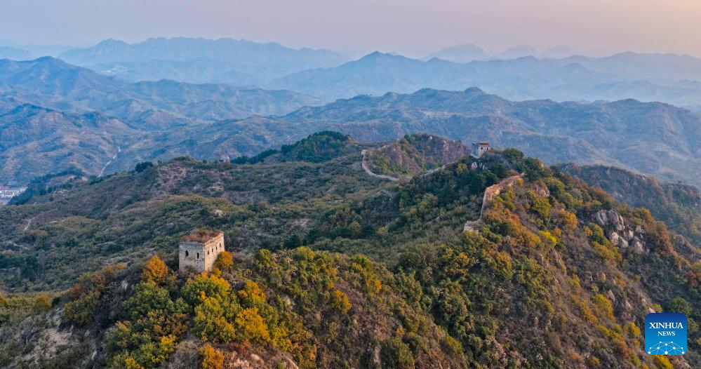 An aerial drone photo taken on Oct. 28, 2025 shows the scenery in the morning at a section of the ancient Great Wall in Zunhua City of north China's Hebei Province. (Photo by Liu Mancang/Xinhua)