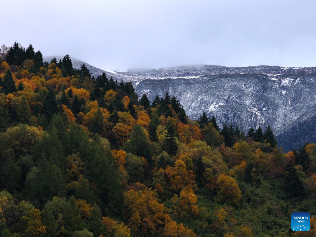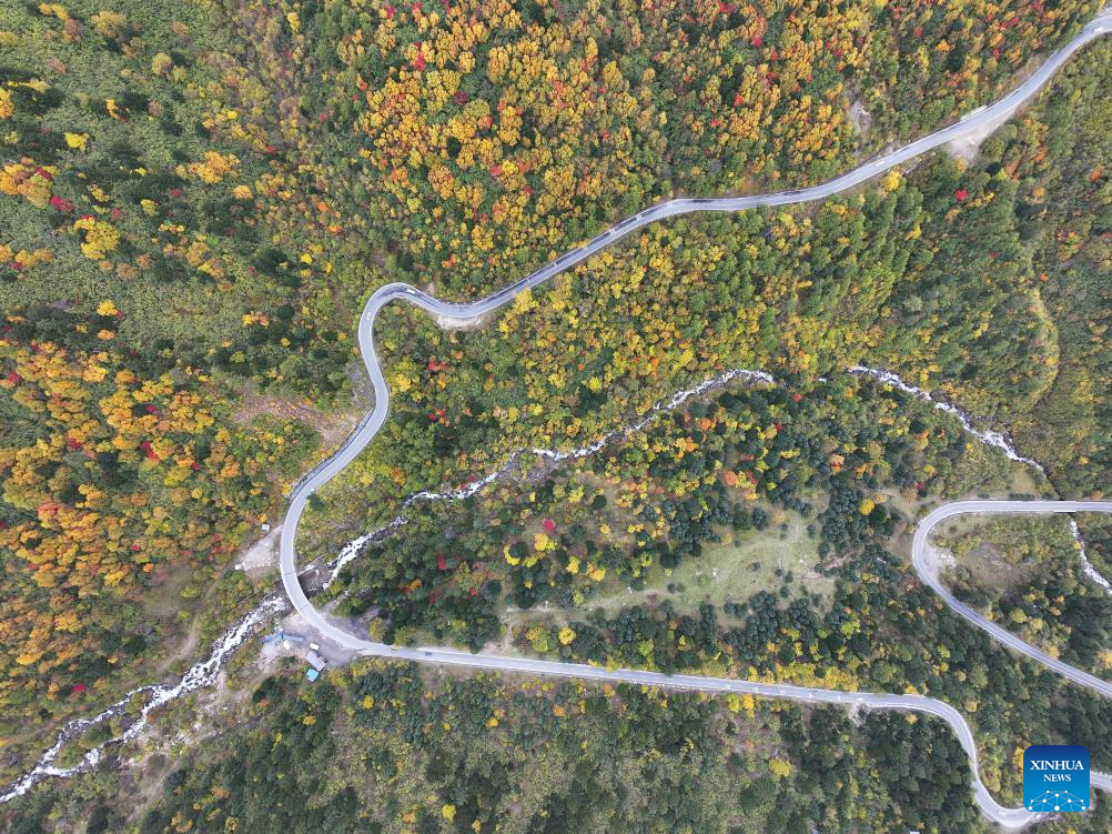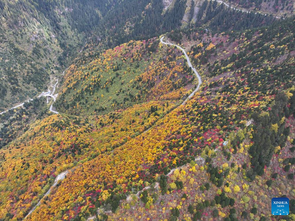 An aerial drone photo taken on Oct. 28, 2025 shows the autumn scenery of Serkyim La Mountain in Nyingchi, southwest China's Xizang Autonomous Region. (Xinhua/Lu Danyang)