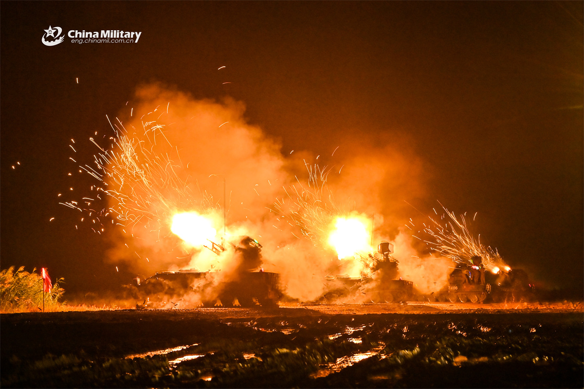 PGZ-04 self-propelled anti-aircraft vehicles attached to an air defense detachment of a brigade under the Chinese PLA 71st Group Army fire at the targets during a live-fire tactical combat training on September 22, 2025. (eng.chinamil.com.cn/Photo by Lin Weihong)