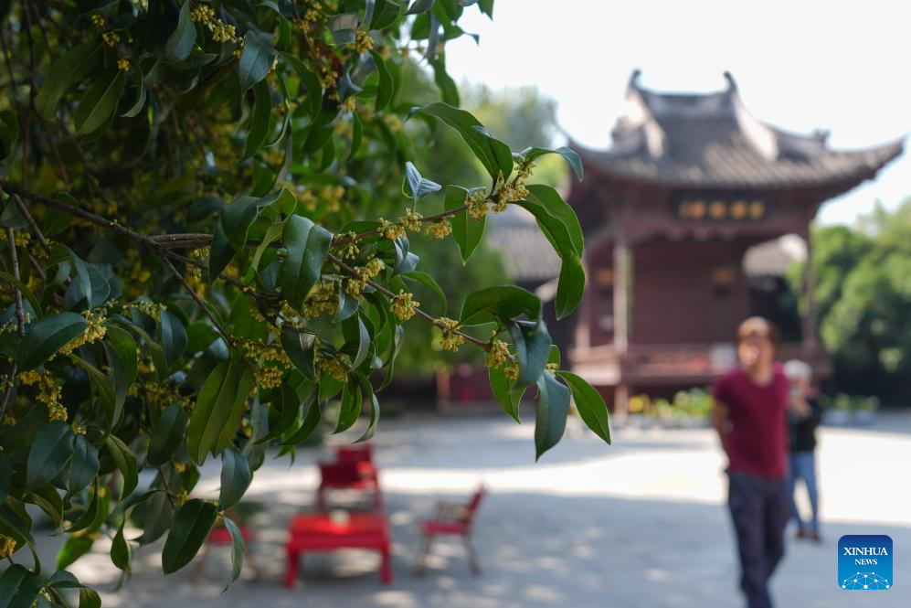 This photo taken on Oct. 29, 2025 shows a view of osmanthus flowers at a temple in the West Lake scenic spot in Hangzhou, east China's Zhejiang Province. Recently, osmanthus flowers in Hangzhou have entered blooming period. More than 5 million osmanthus trees are planted across the city, according to local authorities. (Xinhua/Huang Zongzhi)