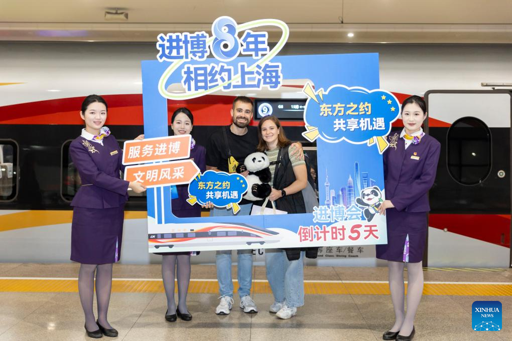 Foreign passengers and train attendants pose for a photo with a countdown board for the 8th China International Import Expo (CIIE) at Shanghai Hongqiao Railway Station in east China's Shanghai, Oct. 30, 2025. China Railway Shanghai Group Co., Ltd. launched a themed activity here on Thursday, introducing highlights of the upcoming CIIE to passengers aboard the high-speed railway train G8. (Xinhua/Wang Xiang)