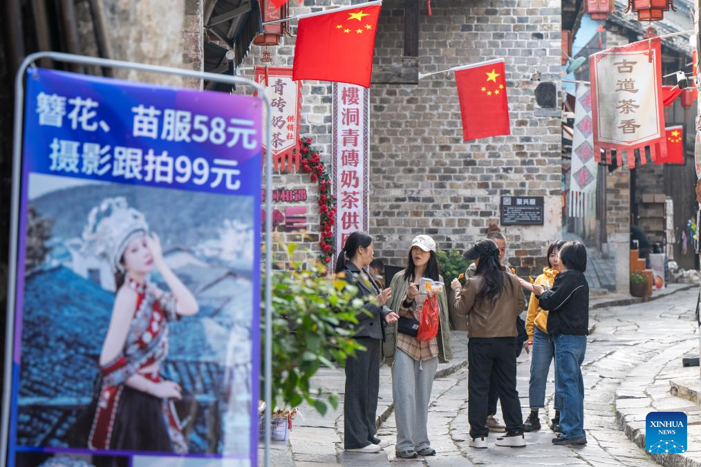 Tourists visit the ancient street in Yangloudong of Chibi City, central China's Hubei Province, Oct. 29, 2025. Yangloudong has long been renowned as the hometown of brick tea and is one of the starting points of an ancient tea road. In recent years, the area has built a new tourism model to attract tourists by creating intangible cultural heritage themed blocks and introducing diversified business formats such as Hanfu-renting and photograph. (Xinhua/Du Zixuan)