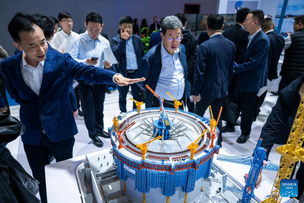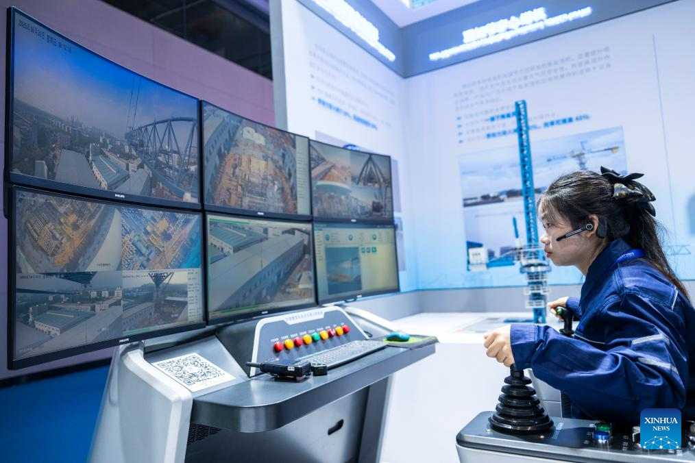 A woman demonstrates an intelligent tower crane control system during the 2025 International (Wuhan) Intelligent Building Industry Expo at the China Optics Valley Convention and Exhibition Center in Wuhan, central China's Hubei Province, Oct. 31, 2025. With an exhibition area of approximately 20,000 square meters, the expo kicked off here on Friday, drawing exhibitors from over 10 countries and regions. (Xinhua/Wu Zhizun)