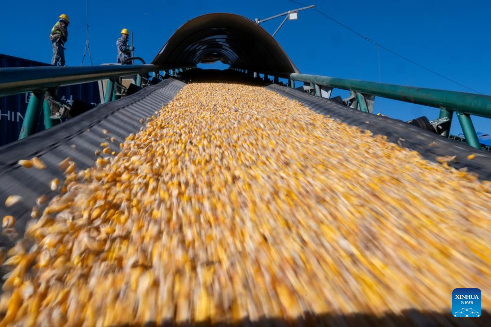 A worker loads grain at a logistics park of China's leading food trader China Oil and FoodStuffs Corporation in Shuangyashan City, northeast China's Heilongjiang Province, Oct. 31, 2025. As Heilongjiang, one of China's major grain-producing province, has recently entered a busy period of grain transportation, China Railway Harbin Group Co., Ltd. has built an efficient and collaborative multimodal transport system, and established a connection mechanism with grain production enterprises in advance, to promote cost reduction, quality improvement and efficiency enhancement of the grain transportation. (Xinhua/Zhang Tao)