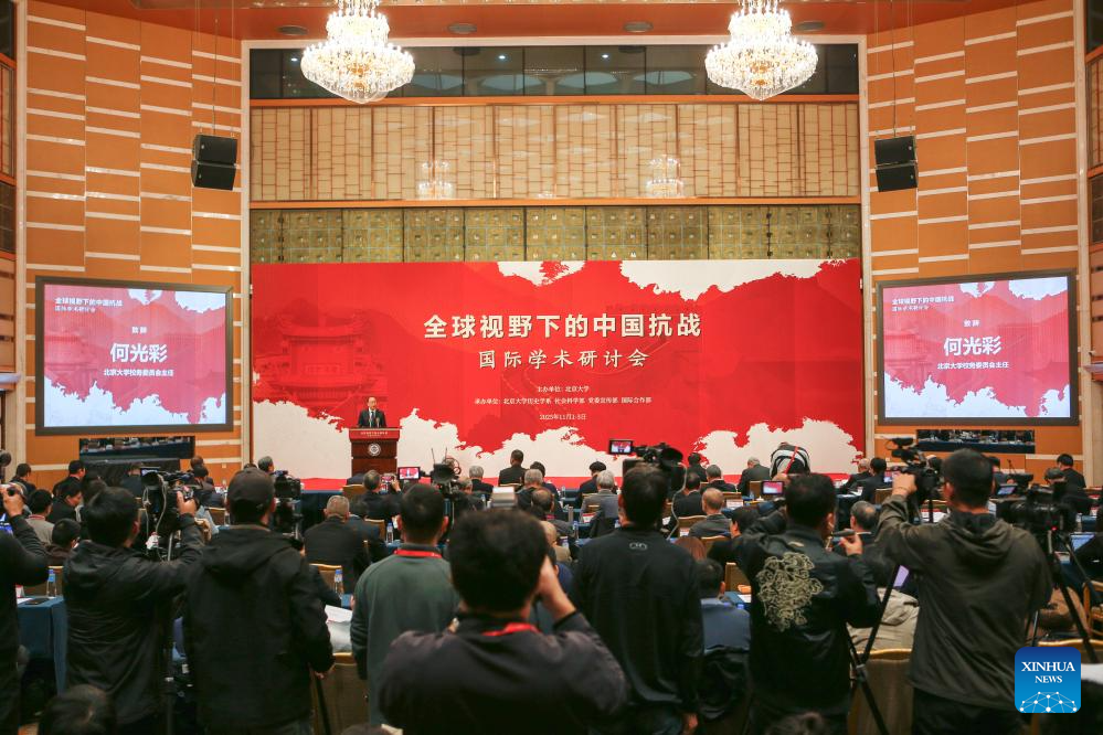 A guest delivers a speech at an international academic symposium on the history of the Chinese People's War of Resistance against Japanese Aggression and Taiwan's restoration to China from a global perspective in Beijing, capital of China, Nov. 2, 2025. The international academic symposium opened in Beijing on Sunday, bringing together nearly 100 experts and scholars. The two-day event is being hosted by Peking University and attended by historians from the Chinese mainland, Taiwan, Hong Kong and Macao, as well as countries such as the United States, Britain and Japan. (Xinhua/Ding Hongfa)