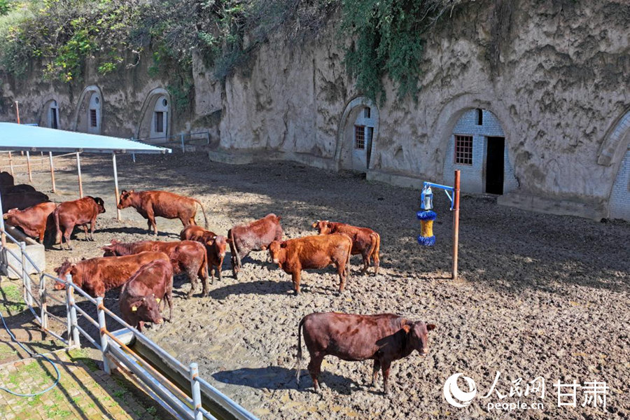 Photo shows cattle raised at cattle barn renovated from cave dwellings in Ganzhuang village, Huangzhai town, Chongxin county, Pingliang city, northwest China's Gansu Province. (People's Daily Online/Mi Yuan)