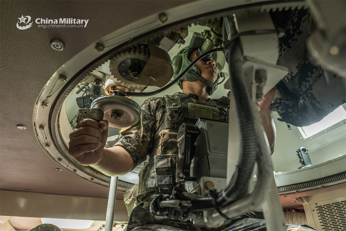 A soldier assigned to a mobile detachment of the Chinese People's Armed Police (PAP) Force Guangxi Corps pinpoints the target through the sight of a vehicle-mounted machine-gun system during a training exercise on such subjects as live-fire drills with anti-riot armored vehicles, flamethrower firing operation, vehicle decontamination operation and others. (eng.chinamil.com.cn/Photo by He Qijun)
