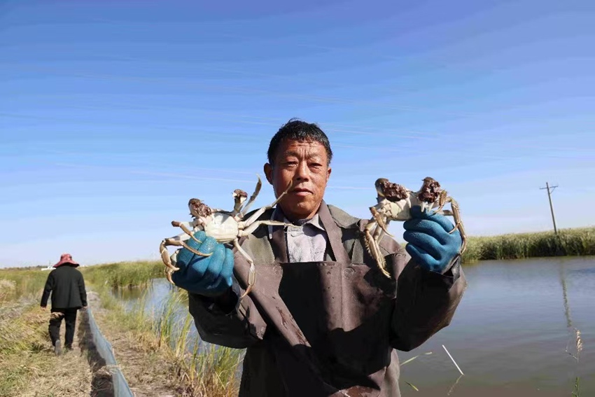 A farmer holds crabs in his hands in a field in northeast China's Jilin Province. (Photo courtesy of the interviewee)