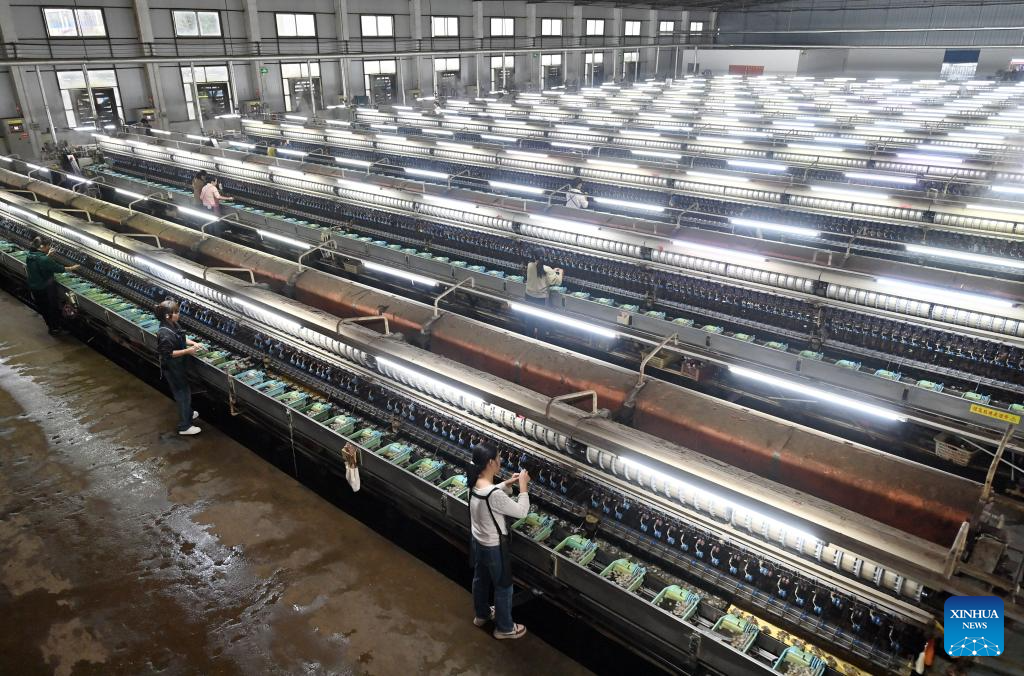 Workers are busy at a silk factory in Xincheng County of Laibin, south China's Guangxi Zhuang Autonomous Region, on Nov. 4, 2025. Xincheng County of Guangxi, boasting a long history of mulberry planting and silkworm raising, has endeavored to extend the silkworm industry chain in recent years. The silkworm industry has boosted the growth of local income and enriched farmers. (Xinhua/Lu Boan)