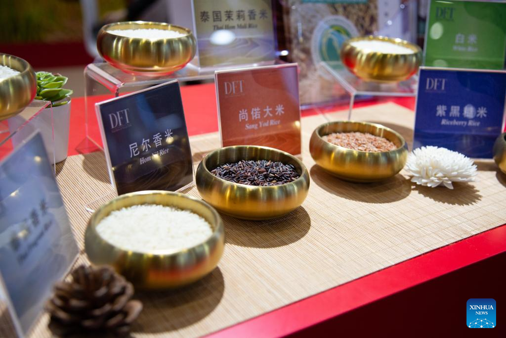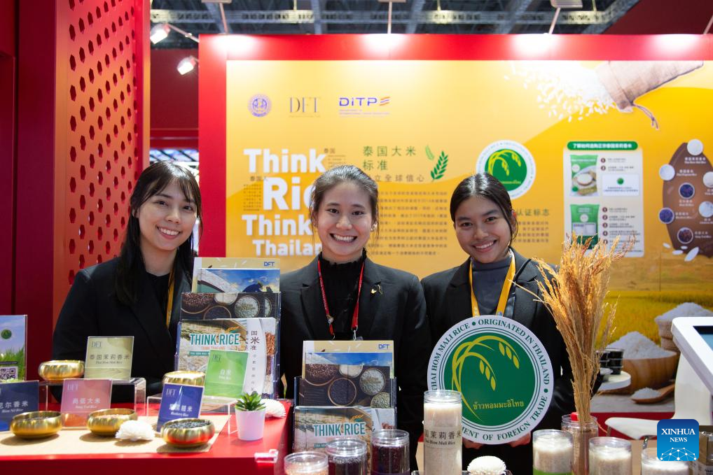 This photo shows rice products exhibited at the Thailand Pavilion during the eighth China International Import Expo (CIIE) in east China's Shanghai, Nov. 5, 2025. The eighth CIIE opened here on Wednesday. Thailand, the United Arab Emirates, Nigeria, Georgia, Sweden and Colombia serve as the guest countries of honor at this year's CIIE. (Xinhua/Tian Weiwei)