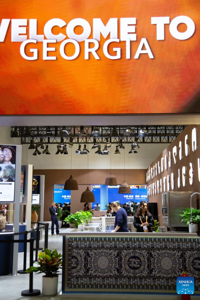 This photo shows the Georgia Pavilion during the eighth China International Import Expo (CIIE) in east China's Shanghai, Nov. 5, 2025. The eighth CIIE opened here on Wednesday. Thailand, the United Arab Emirates, Nigeria, Georgia, Sweden and Colombia serve as the guest countries of honor at this year's CIIE. (Xinhua/Tian Weiwei)