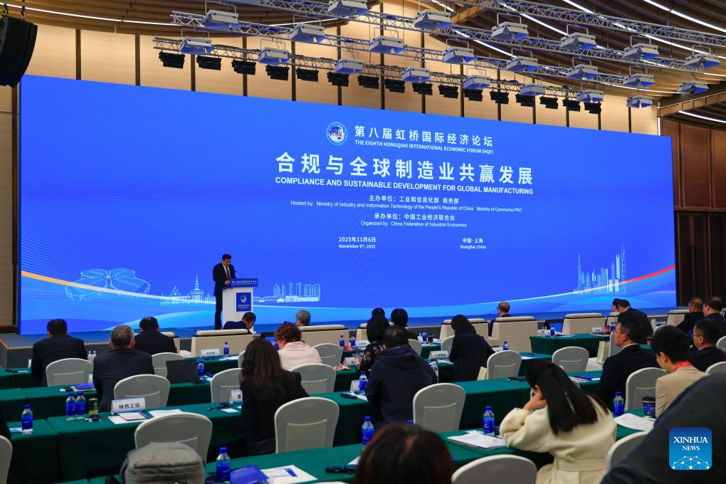 A sub-forum titled "Compliance and Sustainable Development for Global Manufacturing" is held during the 8th Hongqiao International Economic Forum at the National Exhibition and Convention Center (Shanghai) in Shanghai, east China, Nov. 6, 2025. (Xinhua/Liu Jiaqi)
