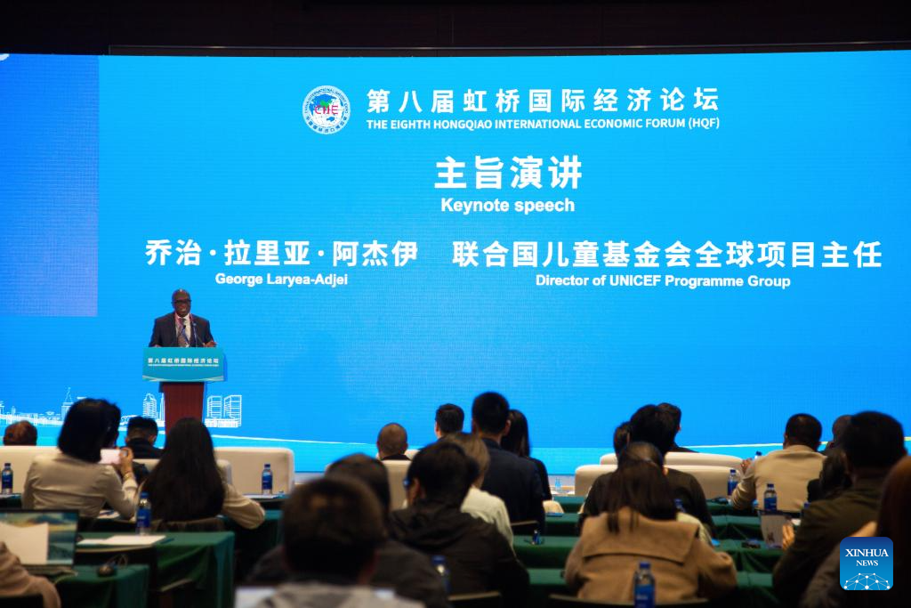 A sub-forum titled "Fostering Resilient Global Industrial and Supply Chains Through Open Cooperation Among Enterprises" is held during the 8th Hongqiao International Economic Forum at the National Exhibition and Convention Center (Shanghai) in Shanghai, east China, Nov. 6, 2025. (Xinhua/Liu Jiaqi)