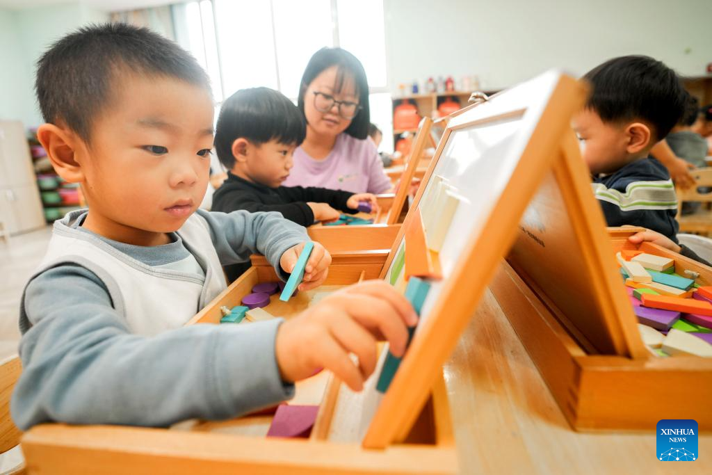 Children of a nursery class build blocks at a kindergarten in Zaozhuang City, east China's Shandong Province, Nov. 6, 2025. Shandong Province has rolled out a series of policies such as developing childcare institutions, increasing kindergarten nursery classes, and offering childcare service in communities to promote its inclusive childcare system, with a focus on the caring of children under three years old. (Photo by Sun Zhongzhe/Xinhua)
