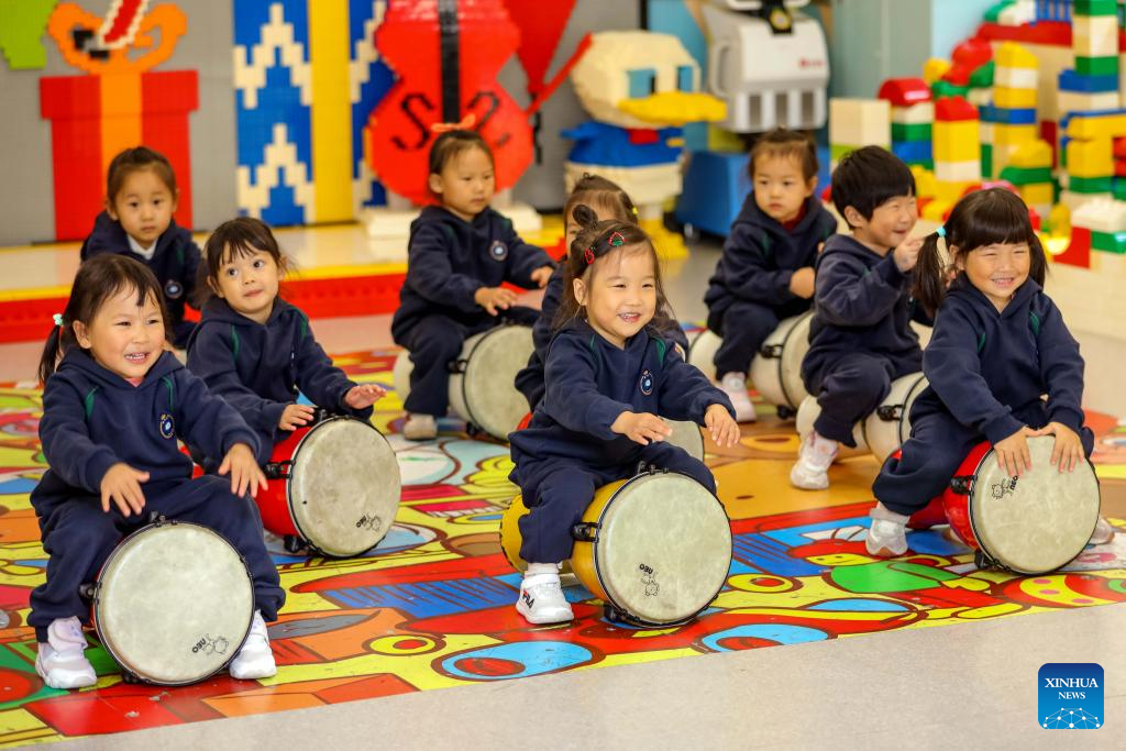 Children learn to play African drums at a nursery center in Qingdao City, east China's Shandong Province, Nov. 4, 2025. Shandong Province has rolled out a series of policies such as developing childcare institutions, increasing kindergarten nursery classes, and offering childcare service in communities to promote its inclusive childcare system, with a focus on the caring of children under three years old. (Photo by Zhang Ying/Xinhua)