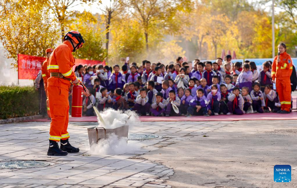 A staff member of Ningxia Helan Mountain National Nature Reserve Administration demonstrates the use of fire extinguisher to students at a primary school in Yinchuan, northwest China's Ningxia Hui Autonomous Region, Nov. 7, 2025. Currently, the risk of forest fire is high across the Helan Mountain. Staff members of local nature reserve administration have rolled out a series of educational activities with the theme of forest fire prevention, aiming to enhance students' safety awareness via lectures, equipment demonstrations, and hands-on experiences. (Xinhua/Yang Zhisen)