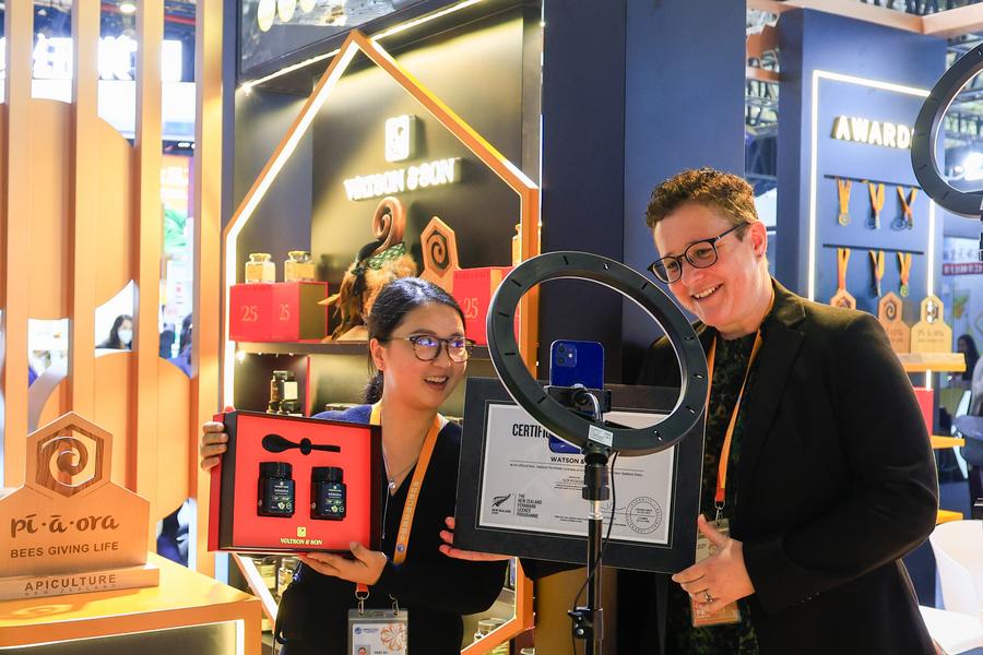 Exhibitors conduct a live streaming event at the booth of a New Zealand honey brand at the Food and Agricultural Products exhibition area during the eighth China International Import Expo (CIIE) in east China's Shanghai, on Nov. 6, 2025. (Xinhua/Liu Jiaqi)