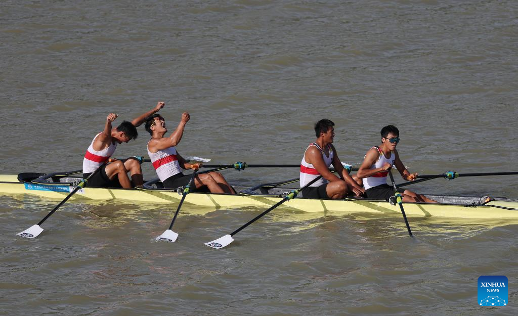 Team Jiangsu celebrate after the men's quadruple sculls final of rowing at China's 15th National Games in Guangzhou, south China's Guangdong Province, Nov. 10, 2025. (Xinhua/Xiao Ennan)