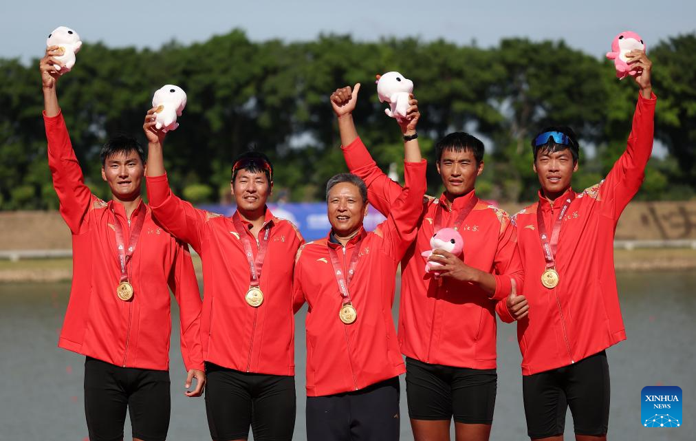 Gold medalists team Jiangsu (C), silver medalists team Guangdong (L), bronze medalists team of Inpidual Athletes pose during the awarding ceremony for the men's quadruple sculls final of rowing at China's 15th National Games in Guangzhou, south China's Guangdong Province, Nov. 10, 2025. (Xinhua/Pan Yulong)